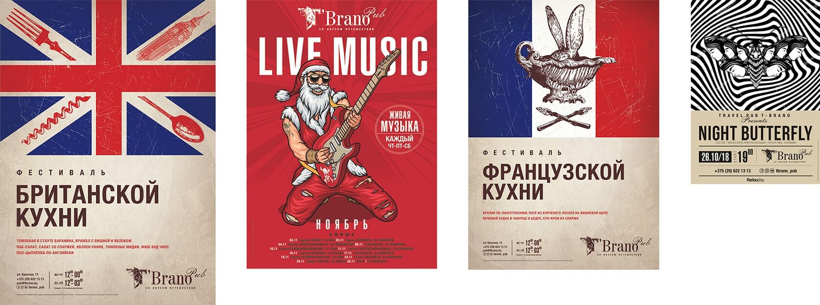 Заведение регулярно устраивает различные мероприятия, поэтому имеет основное, барное, фестивальное, обеденное и тематическое меню. Стояла задача – сделать такой дизайн, чтобы его можно было легко и быстро распечатать для добавления в меню новых позиций или замены существующих. Решение – меню на деревянной подложке, эффектный дизайн, печать на обычном офисном принтере.